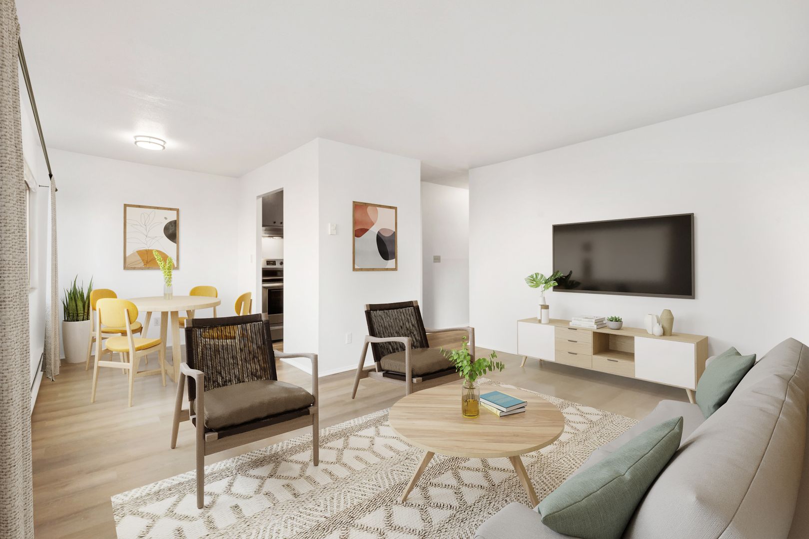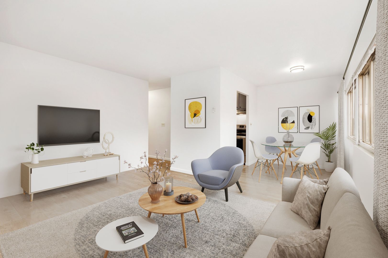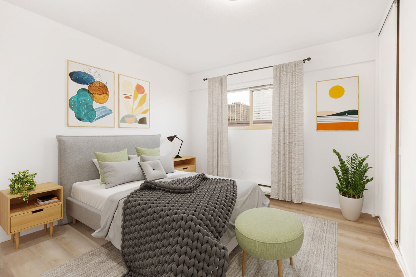 Apartments offer treelined views of an urban park; cityscapes; and a cozy midcentury design. Updated amenities include in-unit washer/dryers; quartz counters; a mod color scheme; and stainless-steel appliances.